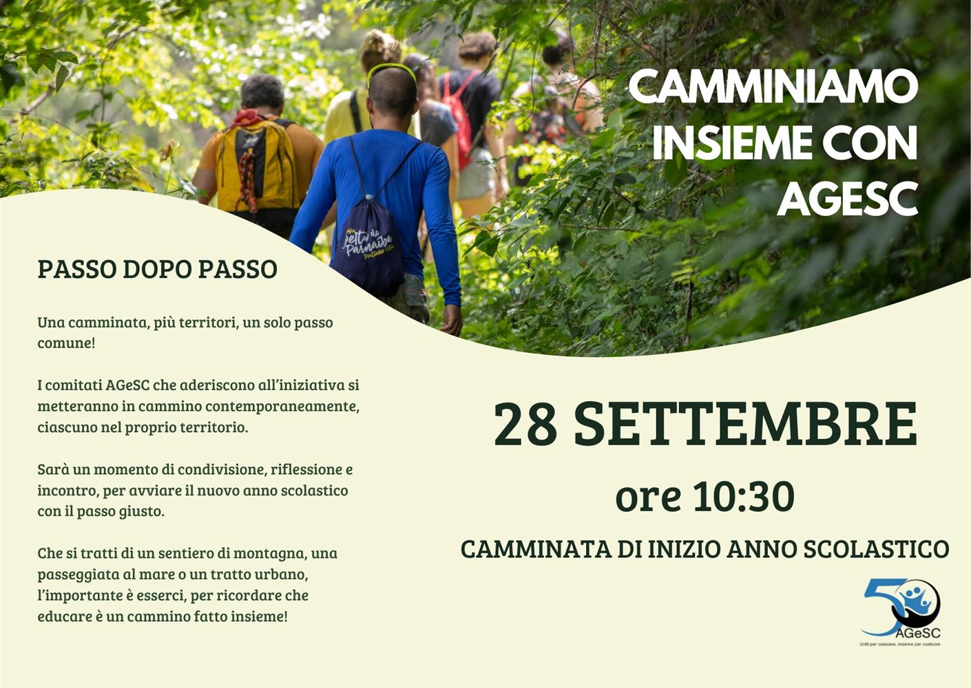 ![]() | 28 settembre 2025 | Alessandria, Belluno, Lucca, Reggio Calabria, Trento | Camminata diffusa di inizio anno scolastico | "Camminiamo insieme con AGeSC" | |