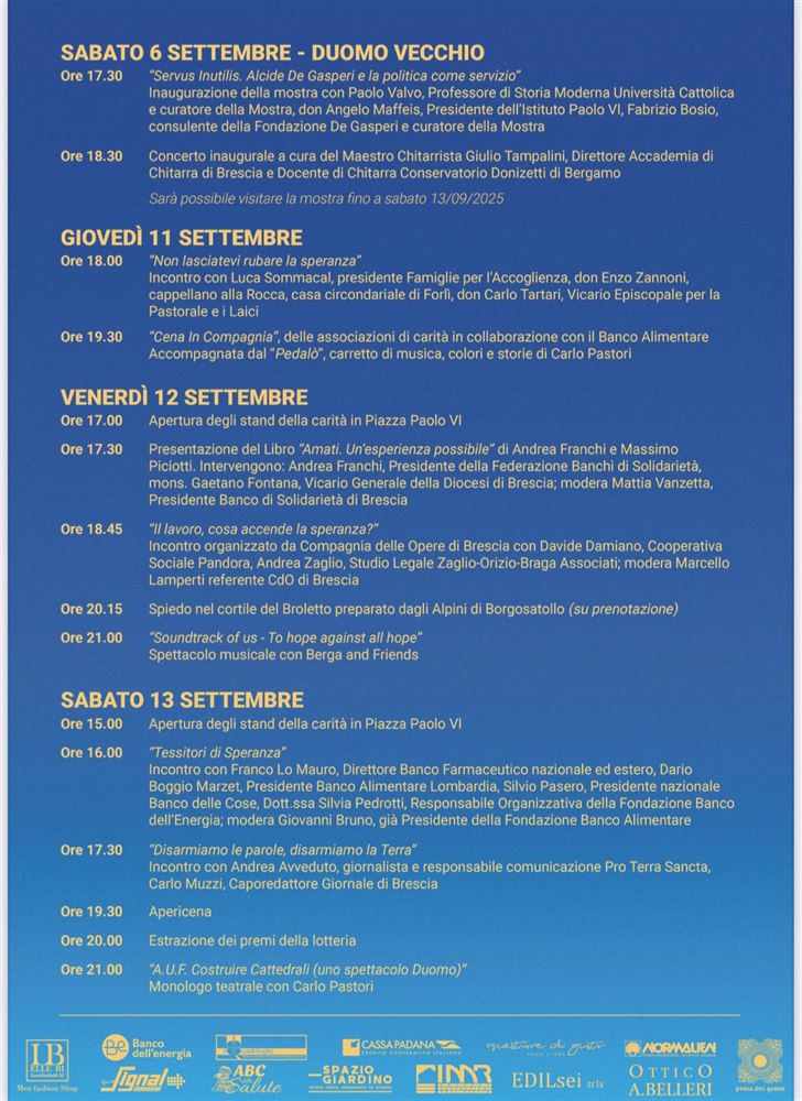 Gli scorsi 11, 12 e 13 settembre, il cuore di Brescia si è riempito di incontri, musica e testimonianze grazie al secondo Meeting dal titolo “Non lasciatevi rubare la speranza”, organizzato dall’Associazione Il Raggio con la collaborazione della Diocesi di Brescia e del Comune di Brescia.